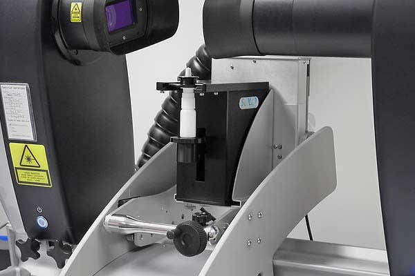 Die Betätigungsvorrichtung für Nasensprays wird auf einer Auflagekonsole innerhalb des Nasensprayzubehörs befestigt. Diese ist auf einer linearen Gleitschiene montiert, sodass der Abstand zwischen dem Messbereich des Spraytec Laserbeugungssystems und dem Nasen-Pumpspray justiert werden kann. Zusätzlich kann das Zubehör geneigt werden, um den Winkel der Betätigungsvorrichtung zu ändern. Diese Einstellungen ermöglichen Anwendern die Einhaltung der amerikanischen FDA-Richtlinien zum Testen von Nasensprays im Rahmen von Bioverfügbarkeits- und Bioäquivalenzstudien.
